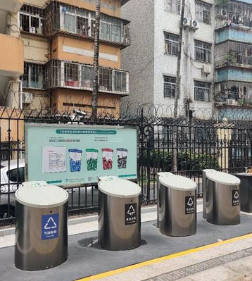 由地面小區標準4分類不銹鋼果皮箱和地埋隱藏的660L大垃圾桶組合而成,垃圾由不銹鋼桶身投放后掉到地下大垃圾桶中密閉存儲,防異味蚊蟲清潔環保。